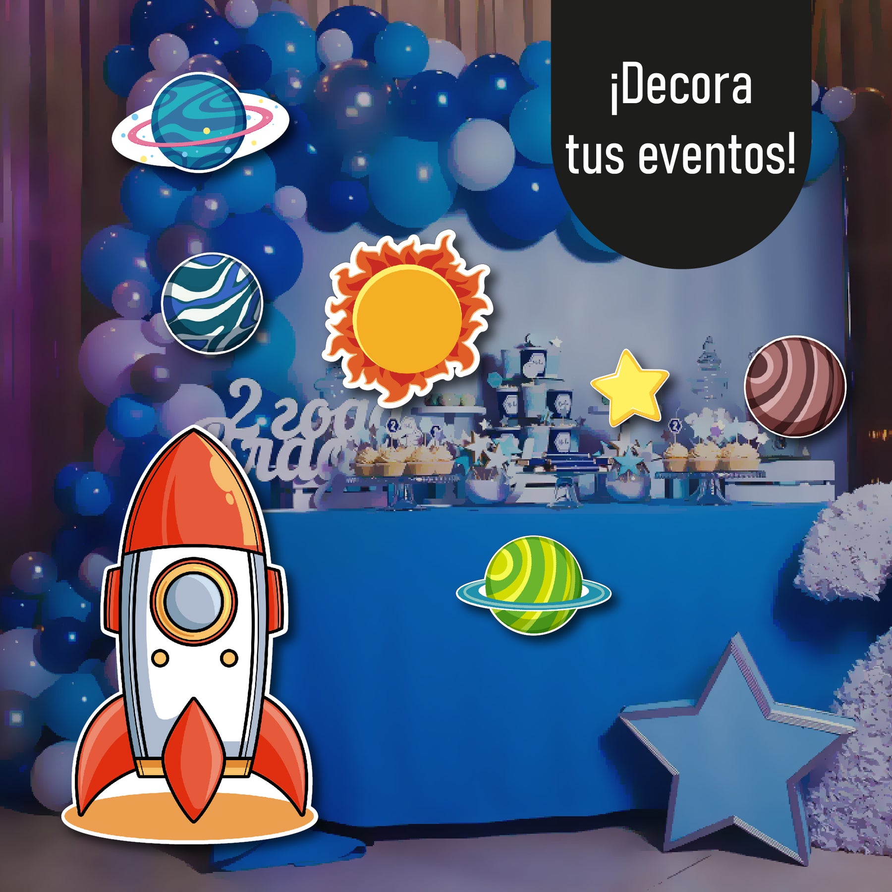 Lleva la magia del espacio exterior a tus eventos o decoración diaria y permite que los niños disfruten de un ambiente lleno de estrellas, planetas y aventuras espaciales. ¡Perfecto para inspirar a futuros astronautas!
