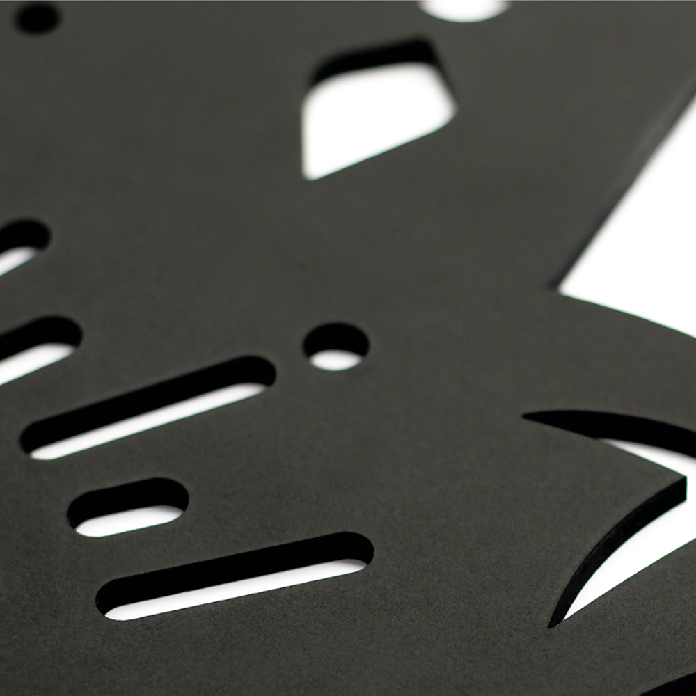 - Acabados: Nuestros cuadros, piezas y figuras de pared decorativas son elaborados de fibra de madera de densidad media. El terminado de las piezas está compuesto por 2 capas de pintura automotriz en color negro mate.